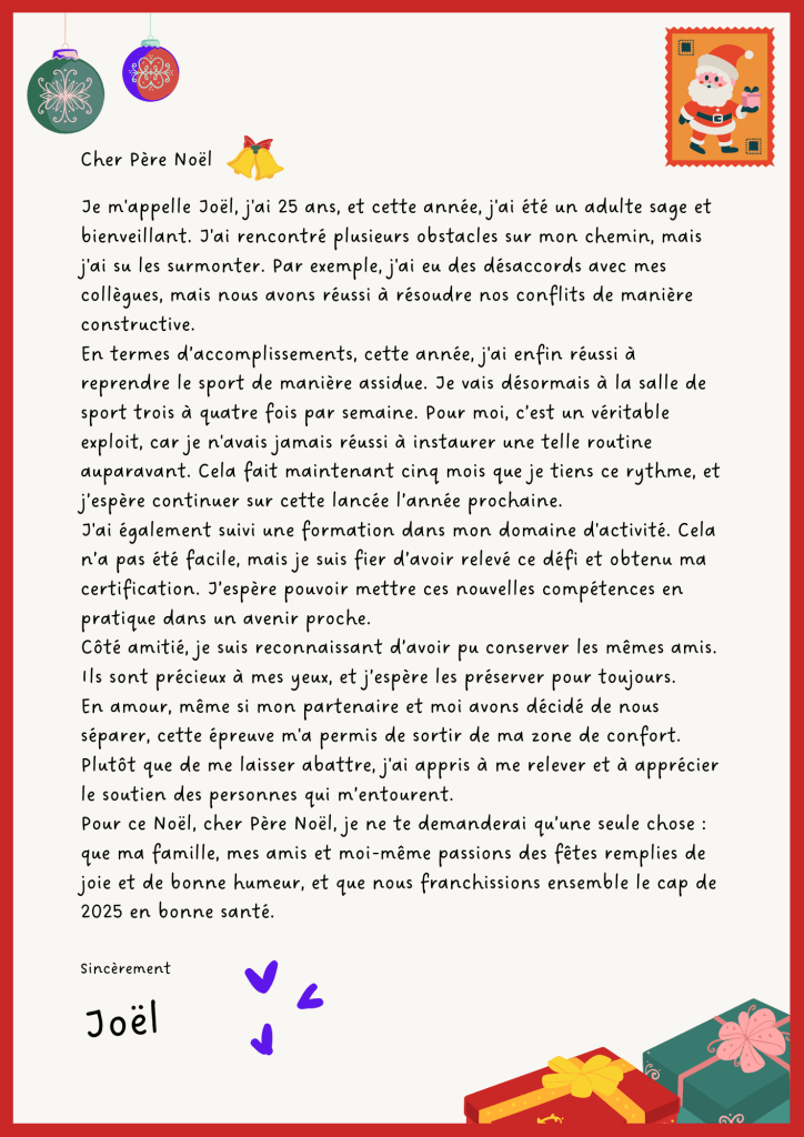Prenez quelques instants pour écrire votre propre lettre au Père Noël. Ce petit exercice peut sembler anodin, mais il est puissant pour renforcer votre estime de vous-même et vous aider à aborder la nouvelle année avec un esprit positif. Alors, à vos stylos ! N’hésitez pas à les partager avec nous, ou à nous faire un retour !